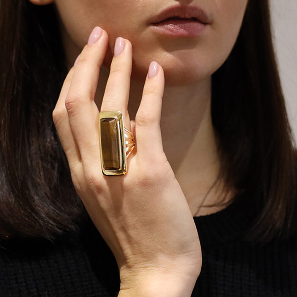 La bague à volume longue en argent doré avec une pierre naturelle œil de tigre est un bijou d’exception qui saura ajouter une touche d’élégance à votre tenue. Sa couleur marron et son métal doré lui confèrent un style raffiné et intemporel, parfait pour toutes les occasions. Fabriquée en argent 925/1000, cette bague de qualité est un véritable bijou de créateur qui mettra en valeur votre féminité et votre personnalité.