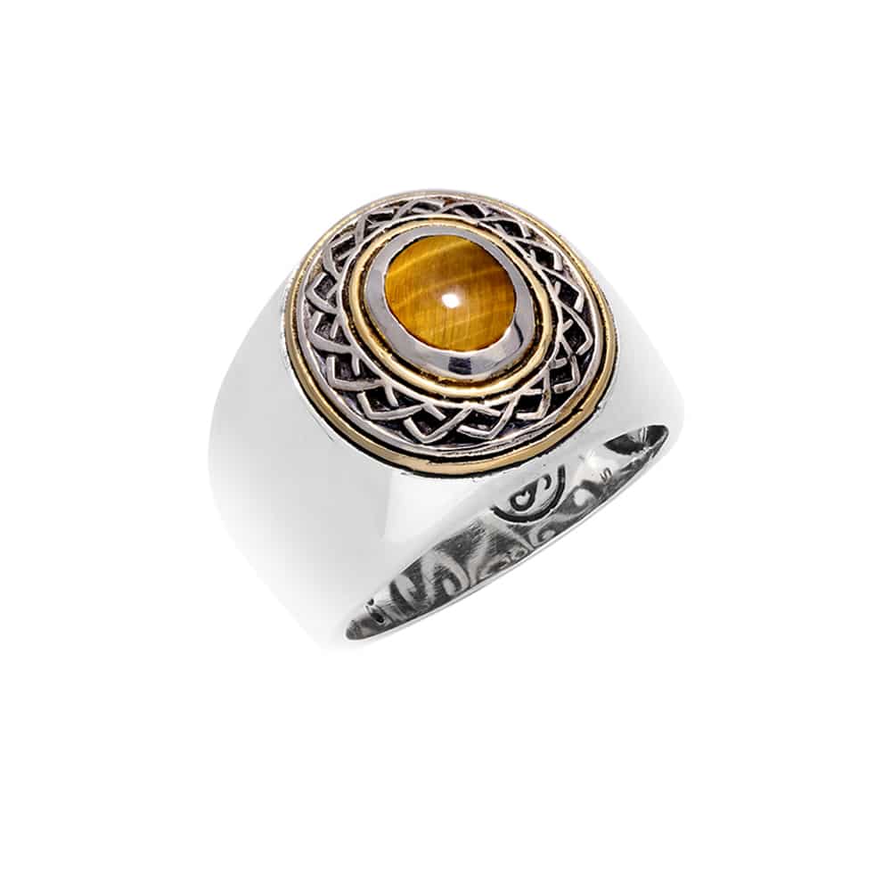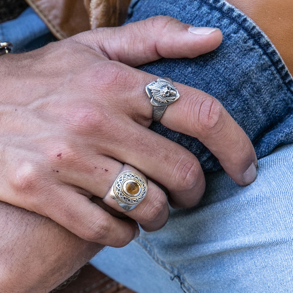 Cette bague pour homme en argent ethnique tribal œil de tigre est un véritable bijou de la collection Urban Chic. Son design unique et tendance saura mettre en valeur le poignet de celui qui la porte. La pierre marron œil de tigre apporte une touche d’originalité et de mystère à ce bijou, tandis que le métal argenté et doré lui confère une élégance indéniable.