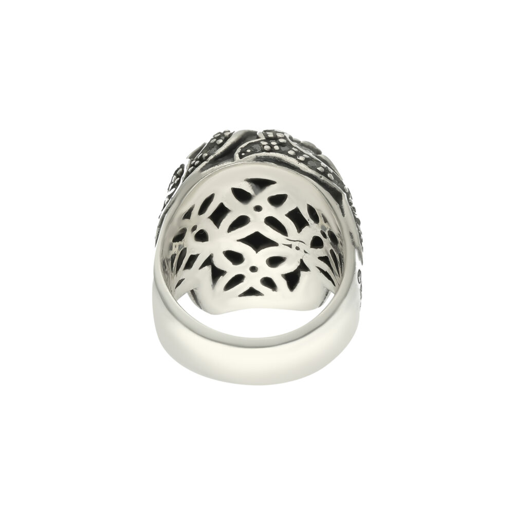 Cet anneau est riche en ornements. En plus de la tête de mort qui trône majestueusement, il est aussi rehaussé de gravures sur le thème mahori. Cet accessoire va vite devenir la pièce forte qui mettra en valeur votre look. A porter absolument avec des vêtements plus épurés pour bien doser le style.