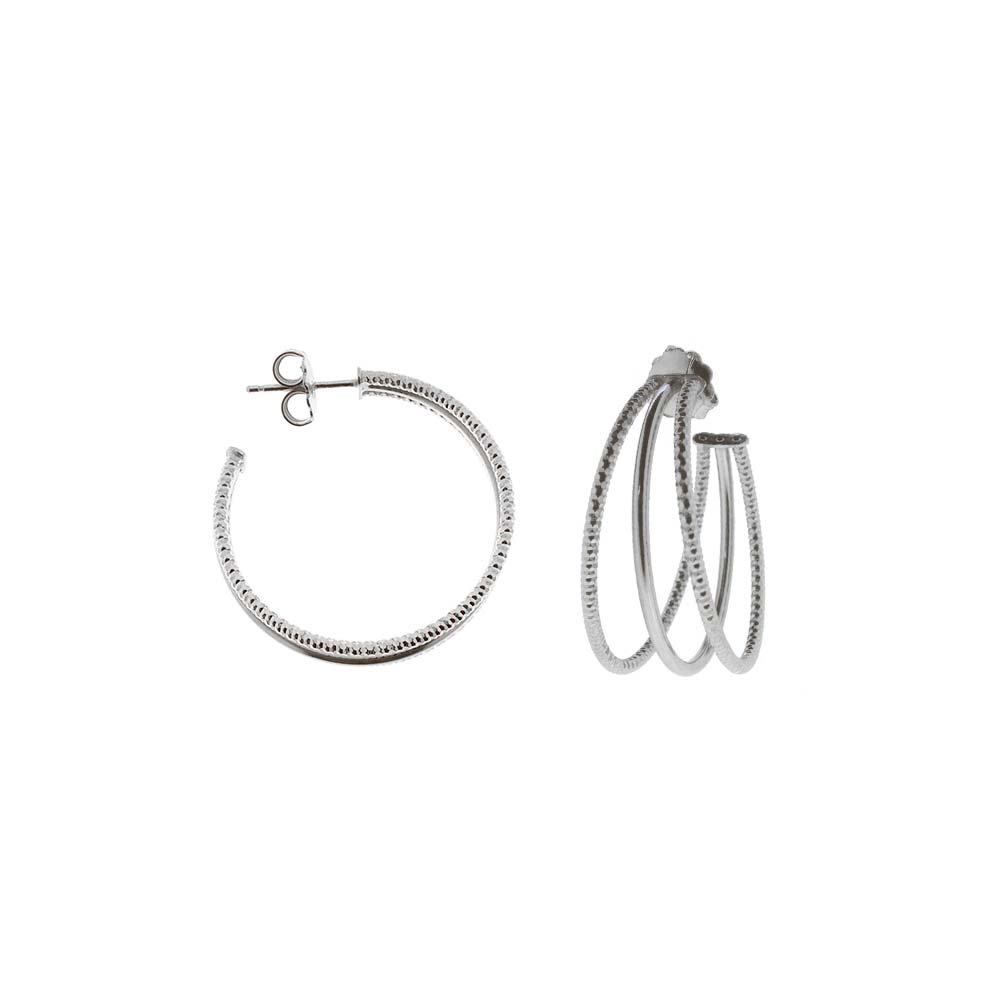 Boucles d oreilles créoles trois anneaux argent rhodié diamantée et lisse diamètre 34mm