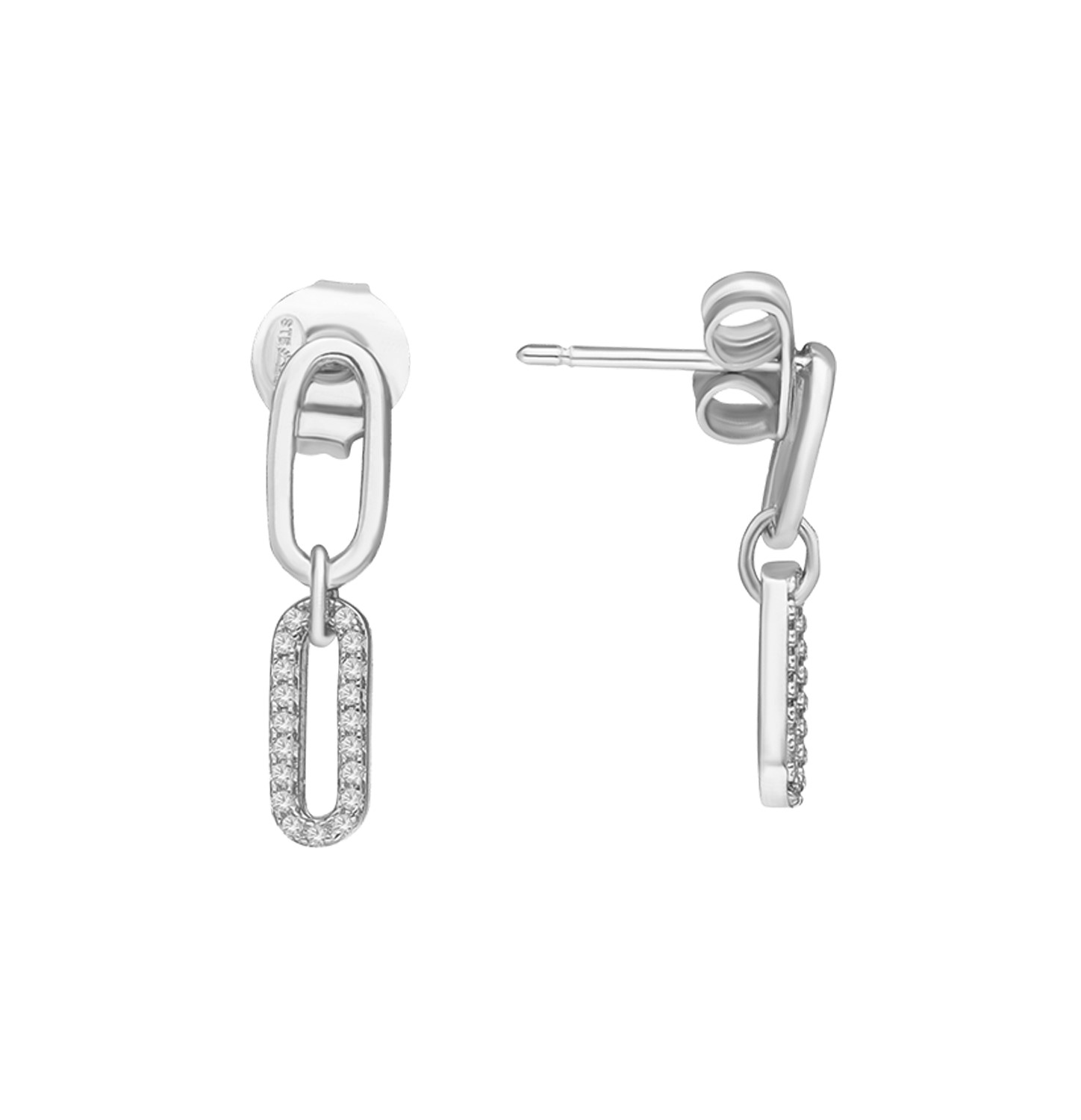 Cette paire de boucles d’oreilles en argent élégantes et raffinées est une chaine qui relie deux éléments, l’un lisse et l’autre serti de pierres en oxyde de zirconium scintillantes.