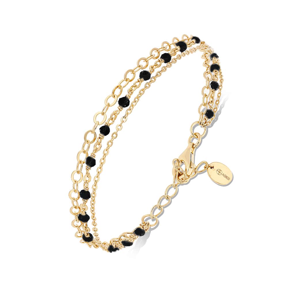 Bracelet argent doré triple chaine petite perles spinelle noire