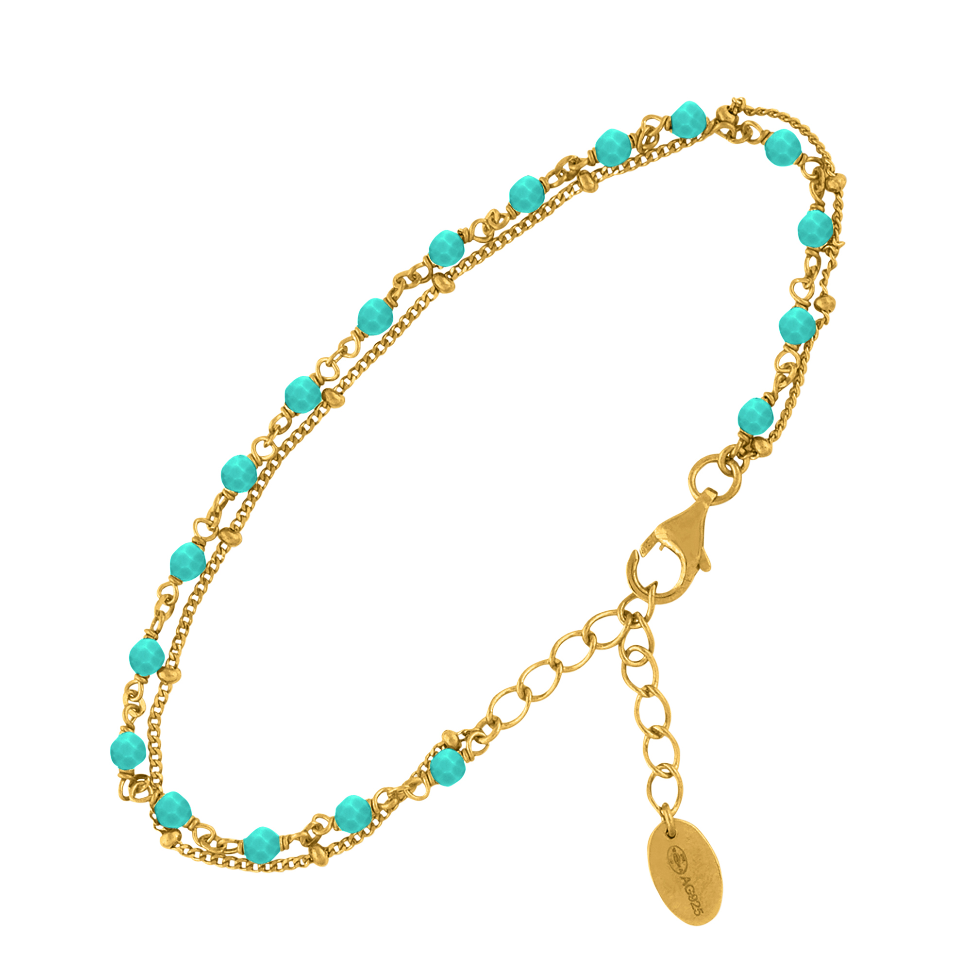 Le bracelet en argent doré double chaine avec pierres naturelles amazonite de la collection Colors est un bijou d’une élégance intemporelle. La pierre amazonite, d’un bleu-vert apaisant, est mise en valeur par le métal doré et l’argent 925/1000 de haute qualité. Ce bracelet est le parfait accessoire pour ajouter une touche de couleur et de sophistication à n’importe quelle tenue.