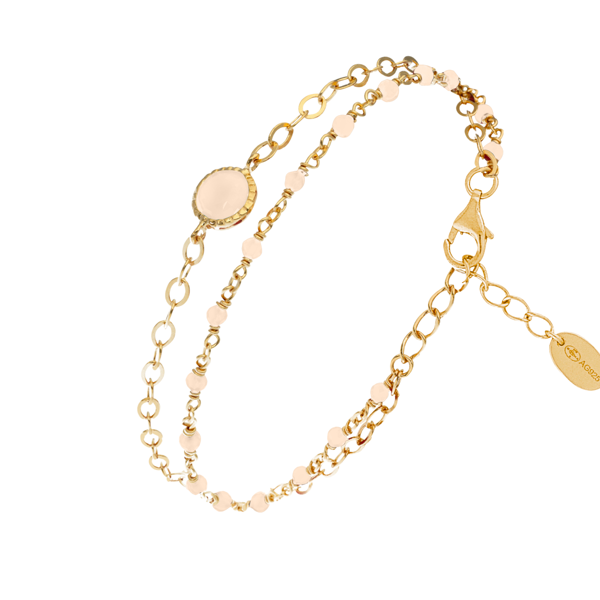 Bracelet en argent doré double chaine pierres naturelles opale rose médaillon opale rose