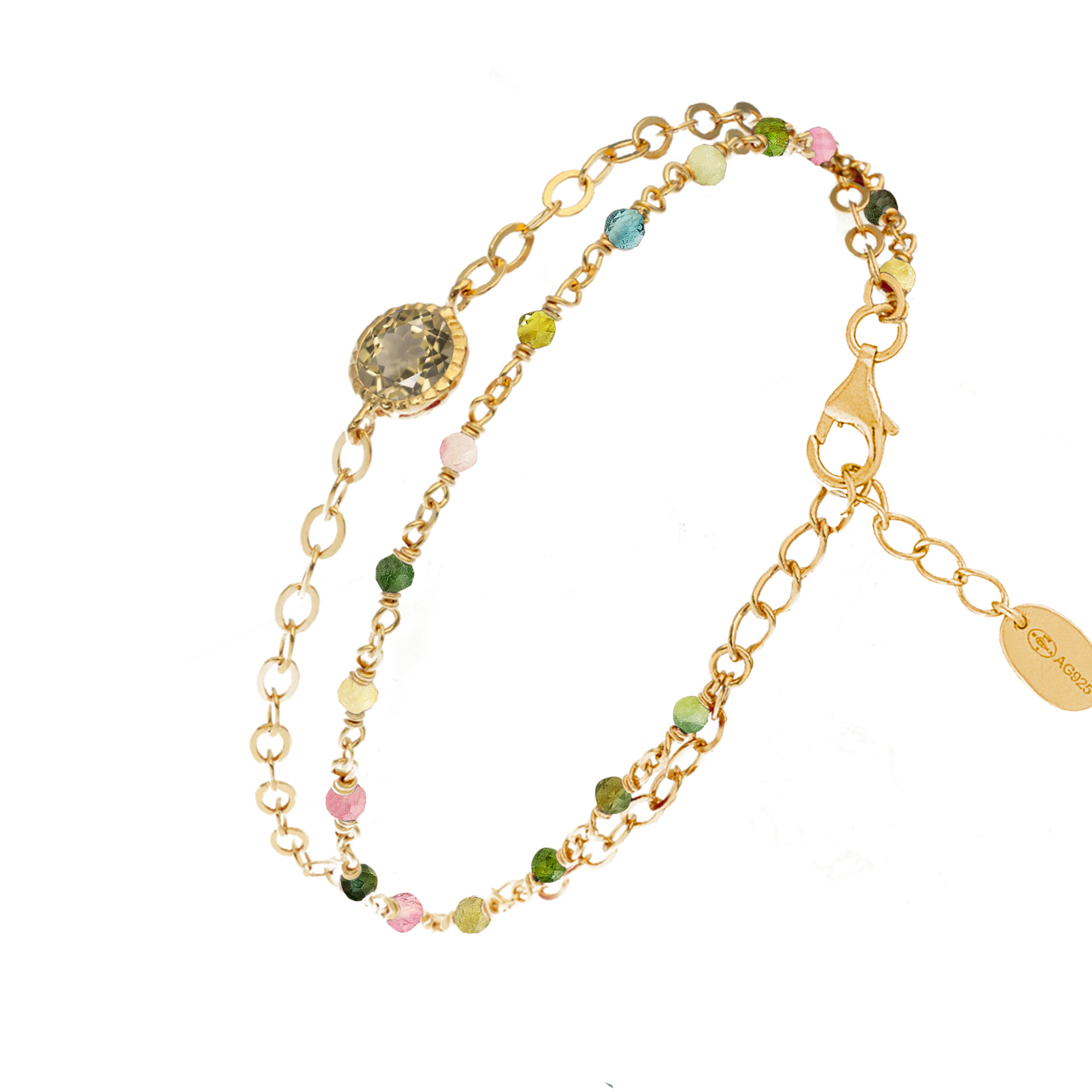 Le bracelet en argent doré double chaine avec des pierres naturelles de tourmaline et un médaillon en quartz fumé est un bijou d’exception de la collection Colors. La combinaison de la tourmaline aux couleurs vibrantes et du métal doré apporte une touche d’élégance et de sophistication à votre tenue. La tourmaline est réputée pour ses propriétés énergisantes et protectrices, vous permettant de rayonner tout au long de la journée.