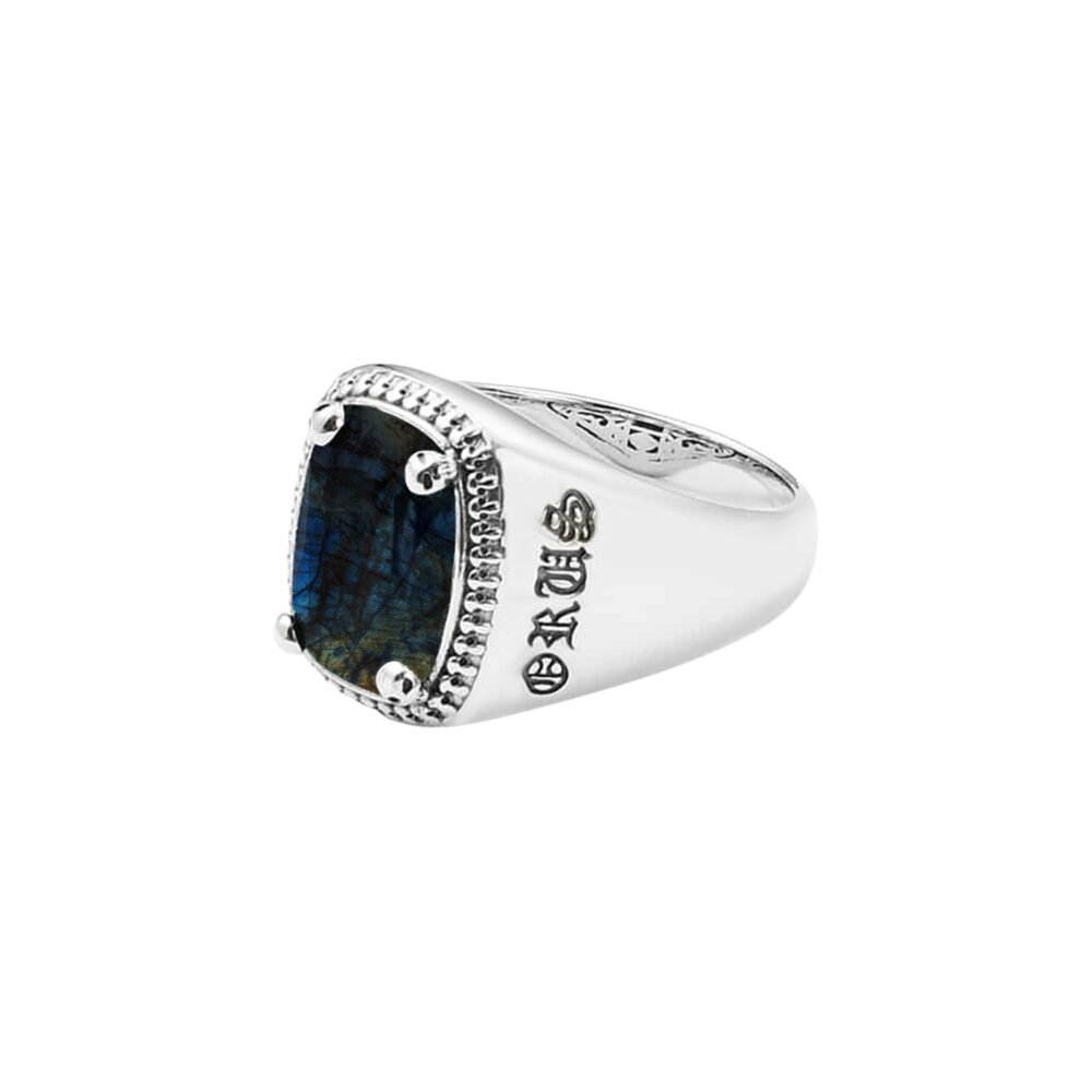 Cet anneau se démarque par sa pierre d’une couleur labradorite si particulier qu’il donne l’impression de regarder dans les profondeurs de l’océan. Cet ornement est soutenu par quatre têtes de mort, disséminés aux quatre coins. C’est à ces parures que le nom de cavalier d’enfer a été donné à ce bijou. Pour les adeptes d’histoires fantastiques, cette bague est un accessoire parfait.