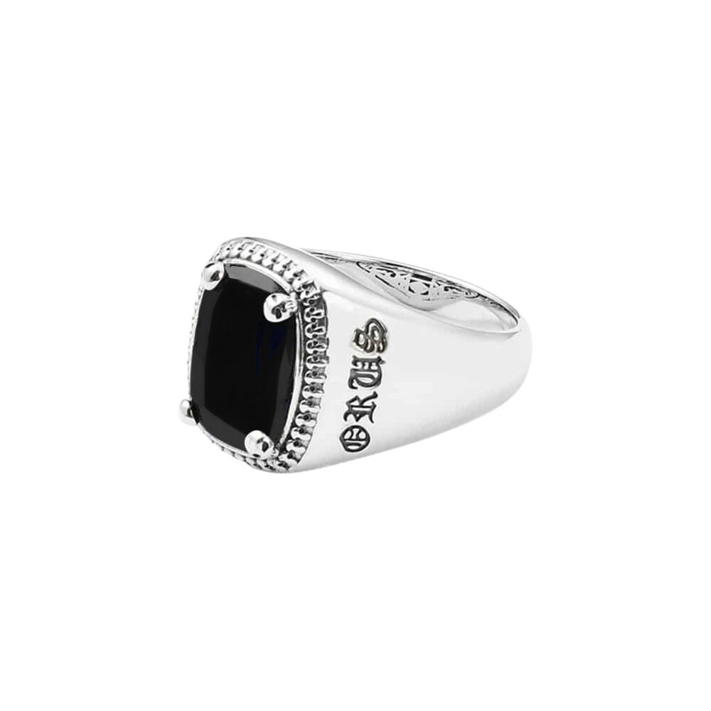 Cet anneau se démarque par sa pierre d’une couleur onyx noir si particulier qu’il donne l’impression de regarder dans le noir profond de la nuit. Cet ornement est soutenu par quatre têtes de mort, disséminés aux quatre coins. C’est à ces parures que le nom de cavalier d’enfer a été donné à ce bijou. Pour les adeptes d’histoires fantastiques, cette bague est un accessoire parfait.