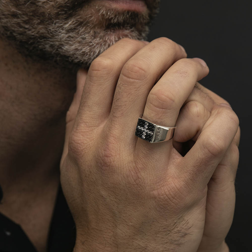 Une Chevalière argent moderne et carée pavée pierre noire comportant une croix blanche. Cette bague représente une force de determination et s’adaptera à tout style. une chevalière est souvent réservée aux hommes.