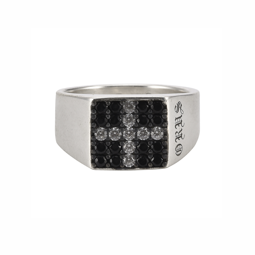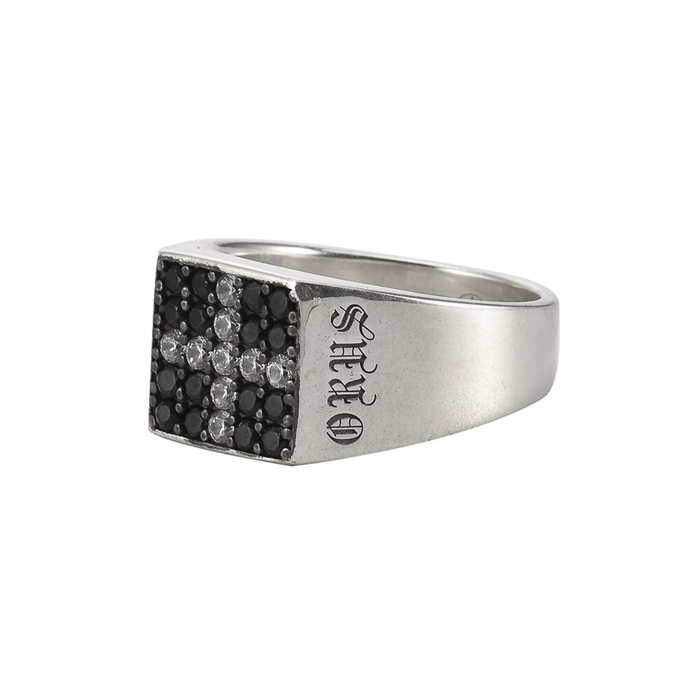 Chevalière argent moderne carré pavée pierre noire et croix blanche