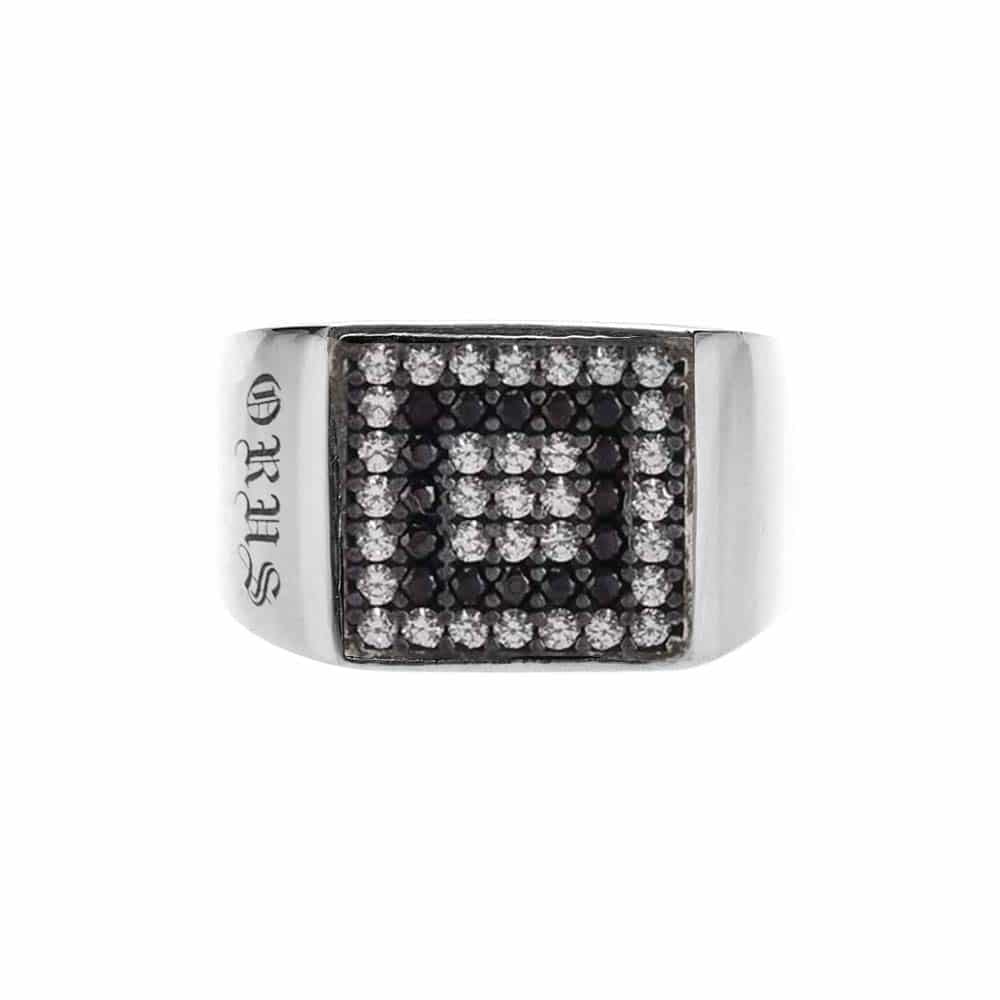 Une Chevalière argent moderne et géométrique pavée pierre noire et blanche. Cette bague représente une force de caractère et s’adaptera à tout style. une chevalière est souvent réservée aux hommes.