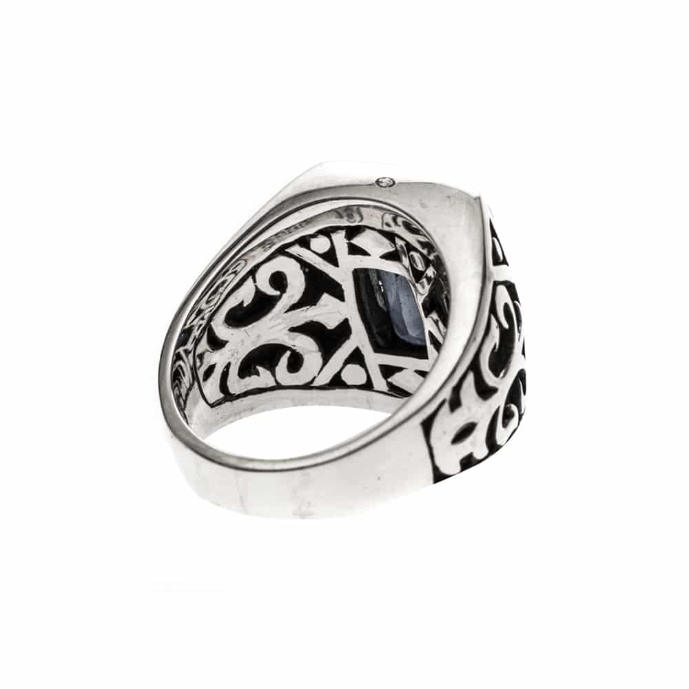 Ce modèle se caractérise par des gravures aux détails minutieusement travaillés, ce qui lui procure une esthétique splendide. Tout autour de l’anneau, des deux côtés, des figures antiques viennent apporter une touche d’originalité. Et pour la touche de classe, nos artisans ont opté pour un sertissage en onyx de couleur noire d’une profondeur hypnotisante.
