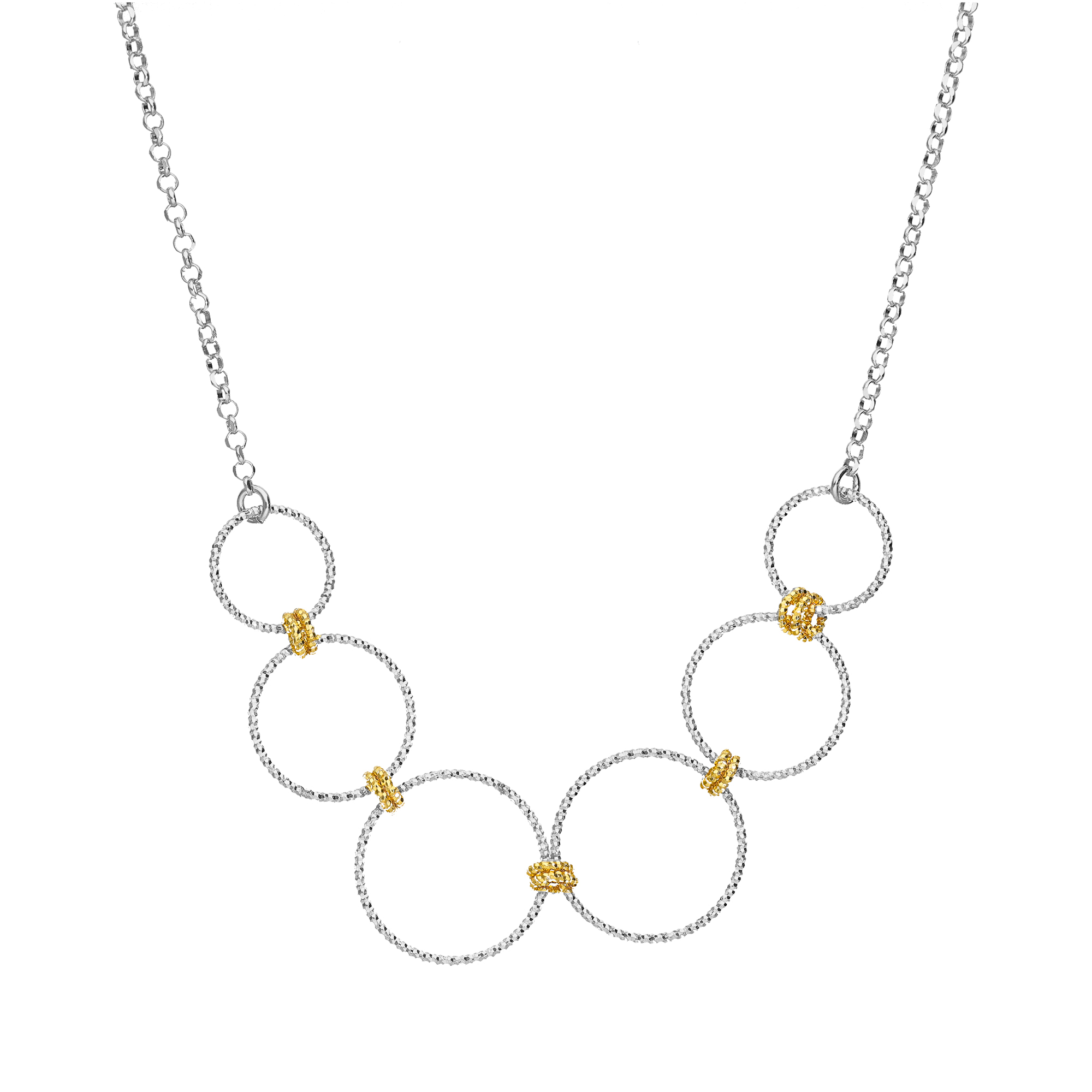 Chaque anneau est méticuleusement réalisé en argent doré bicolore 925, offrant une brillance éblouissante qui ajoute une touche de glamour à votre apparence. La cascade d’anneaux crée un effet visuel captivant, conférant à ce collier une allure unique et contemporaine.