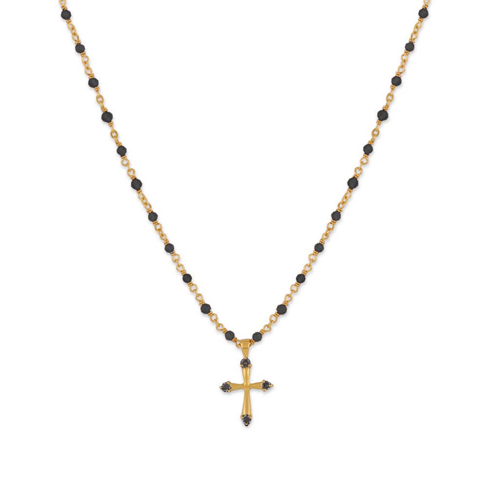 Collier argent doré croix et pierres naturelles noir