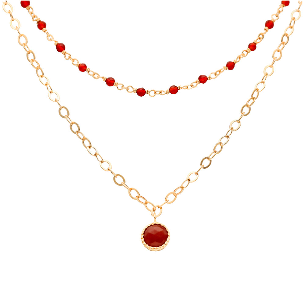 Ce collier argent doré double chaîne est le choix parfait pour celles qui recherchent un bijou unique et original. Sa pampille délicate et ses pierres naturelles rouges lui confèrent une allure à la fois moderne et intemporelle. Que vous le portiez lors d’une soirée élégante ou pour ajouter une touche de glamour à votre tenue quotidienne, ce collier ne manquera pas de faire sensation. Faites-vous plaisir ou offrez-le en cadeau à une personne spéciale, et laissez ce bijou magnifique sublimer votre style avec élégance.