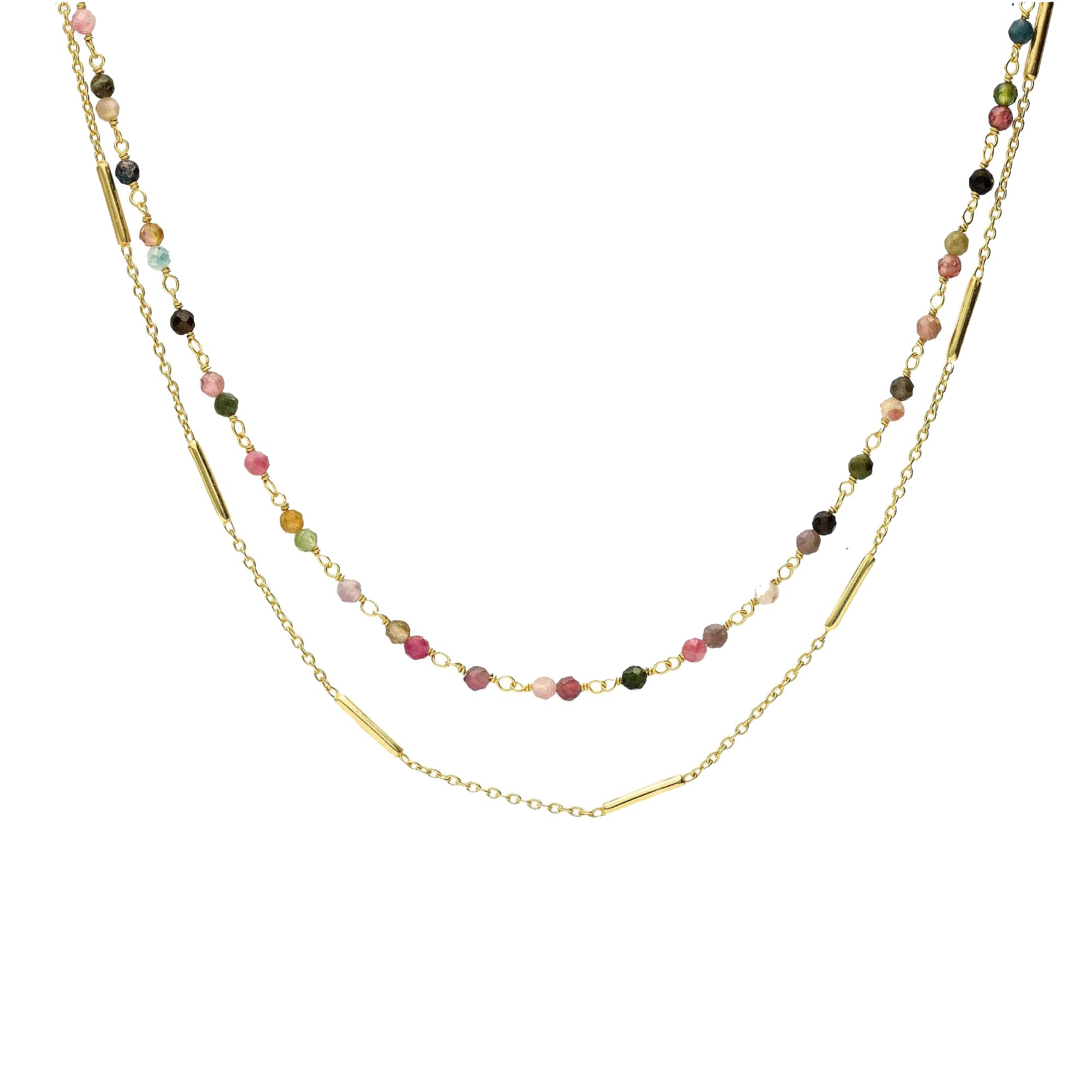 Collier argent doré double chaines barrettes et perles naturelles multi-tourmaline