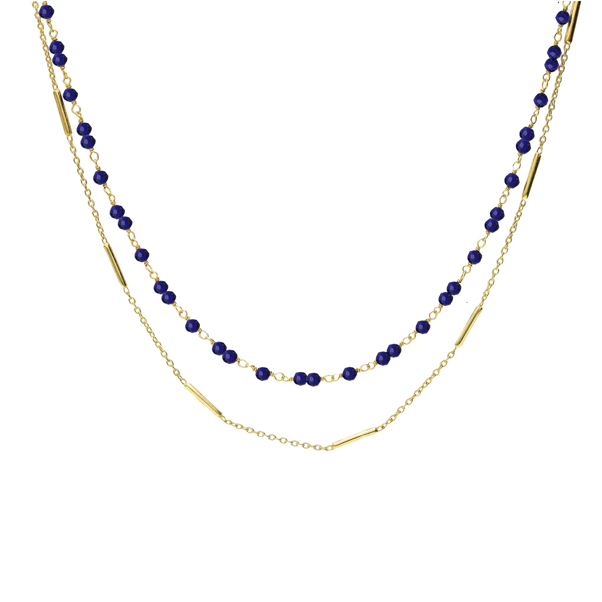 Description du produit Collier argent doré doubles chaînes barrettes et perles naturelles Lapis Lazuli