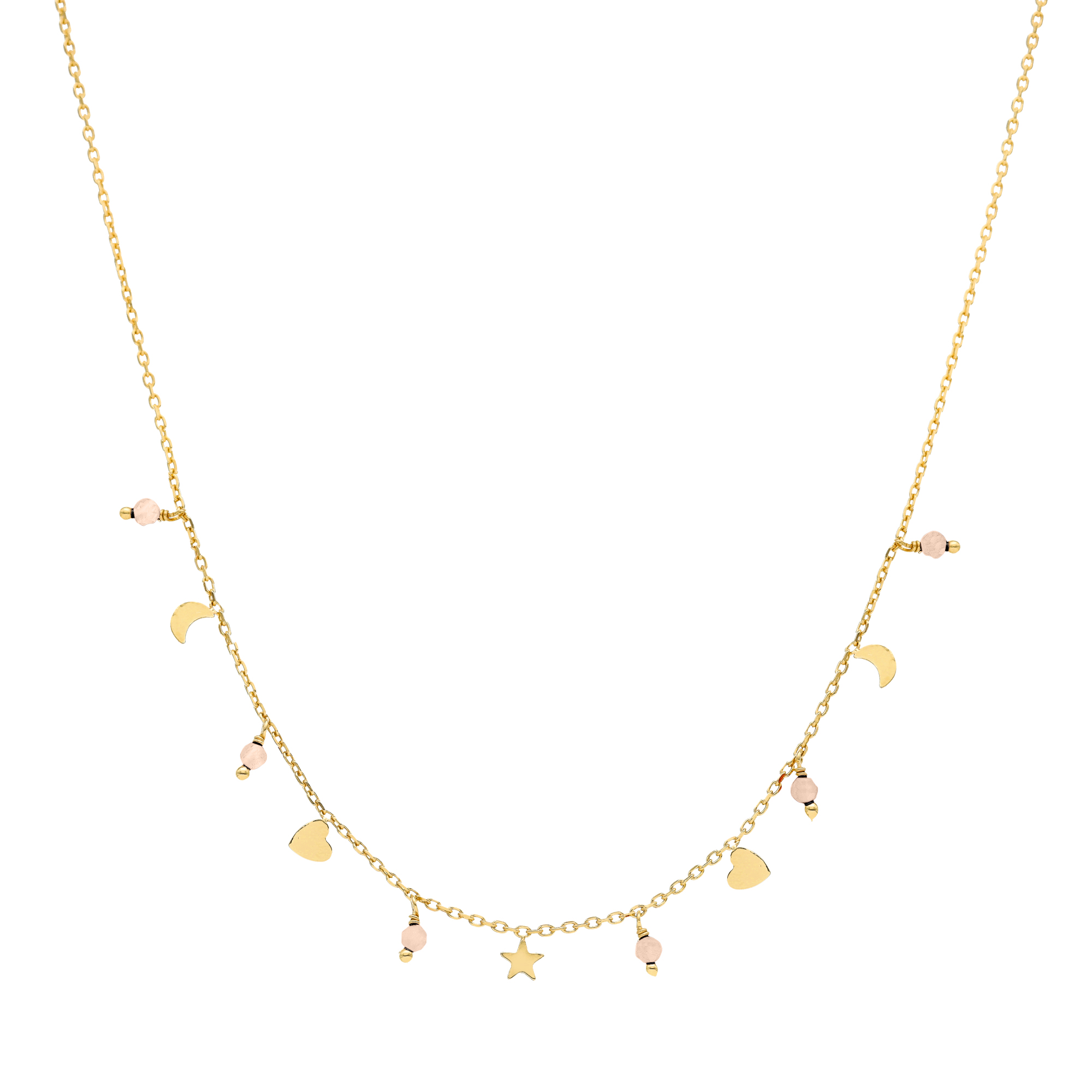 Sublimez votre tenue avec ce magnifique collier argent doré orné de pampilles de forme lune, cœur et pierre opale rose. Ce bijou raffiné fait partie de notre collection Femme, mettant en valeur les pierres naturelles. La couleur opale rose de la pierre apporte une touche de douceur et d’élégance, tandis que le métal doré et l’argent 925/1000 lui confèrent un éclat incomparable.