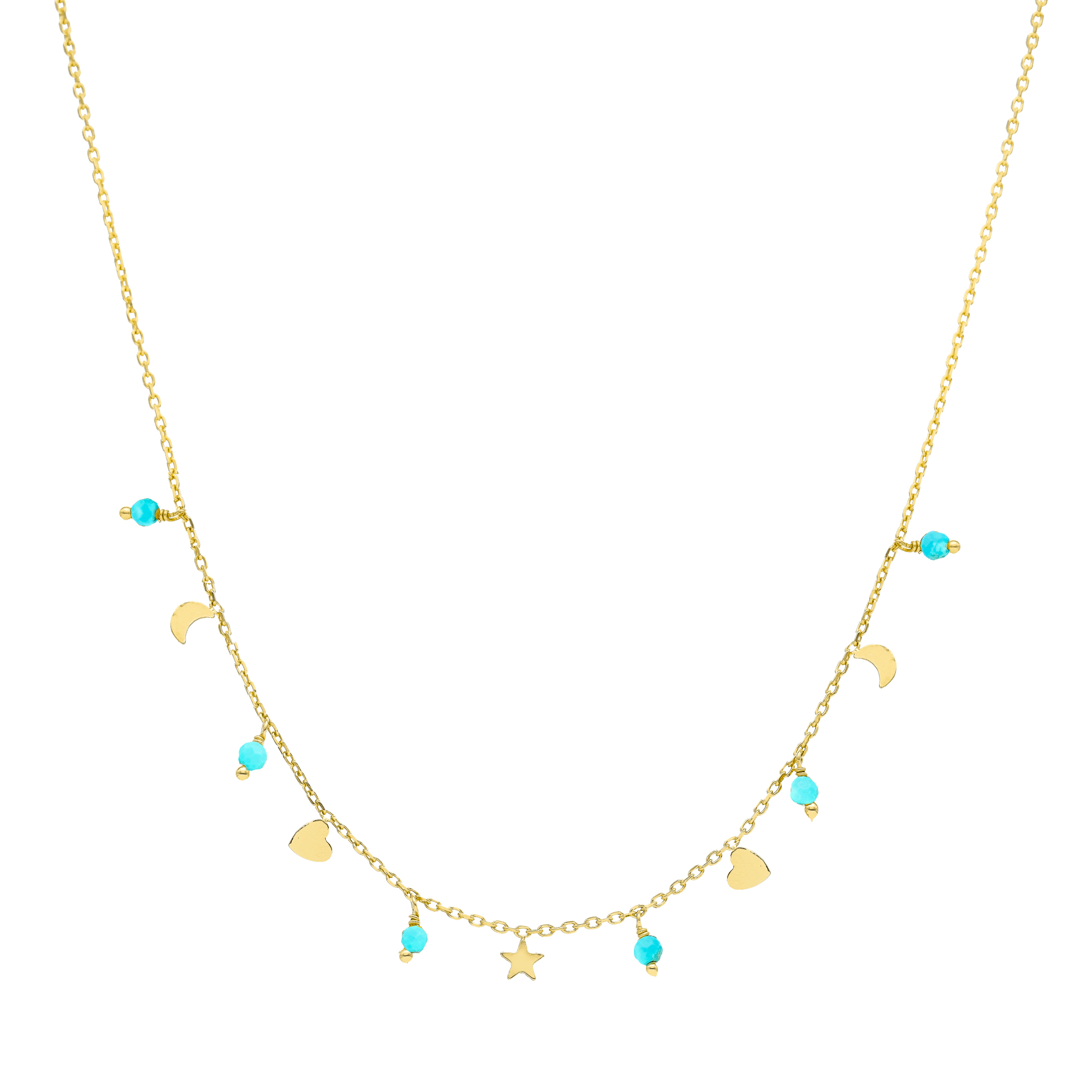 Ajoutez ce collier en argent 925 doré avec pierres naturelles de turquoise et pampilles lune coeur à votre collection de bijoux dès maintenant et ajoutez une touche de couleur et de style à vos tenues.