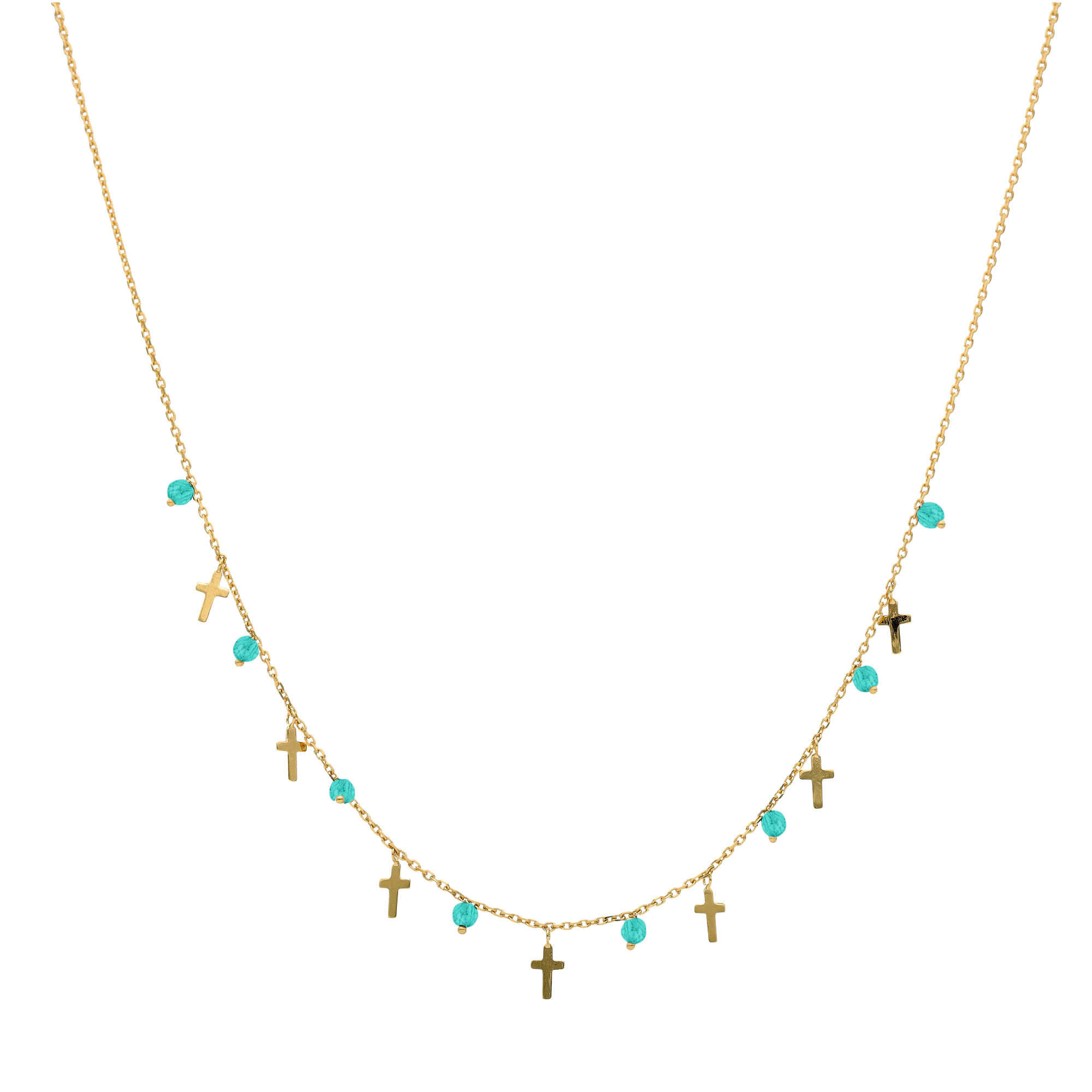 Ce collier fait partie de notre collection femme, mettant en valeur les pierres naturelles et les designs originaux. Offrez-vous ou offrez à un être cher ce bijou raffiné qui ne passera pas inaperçu. Que ce soit pour un cadeau d’anniversaire, de Noël ou simplement pour vous faire plaisir, ce collier argent doré petites croix et pierres naturelles turquoise sera un ajout précieux à votre boîte à bijoux.