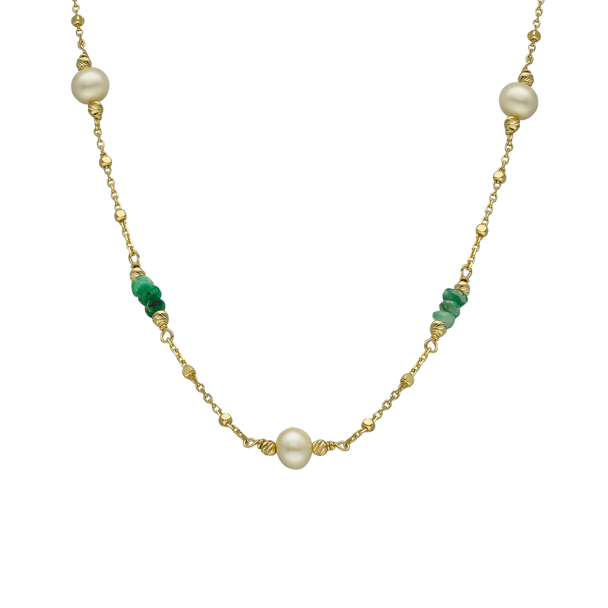 Un collier d’exception en argent doré avec des pierres précieuses émeraude et perle naturelle blanche