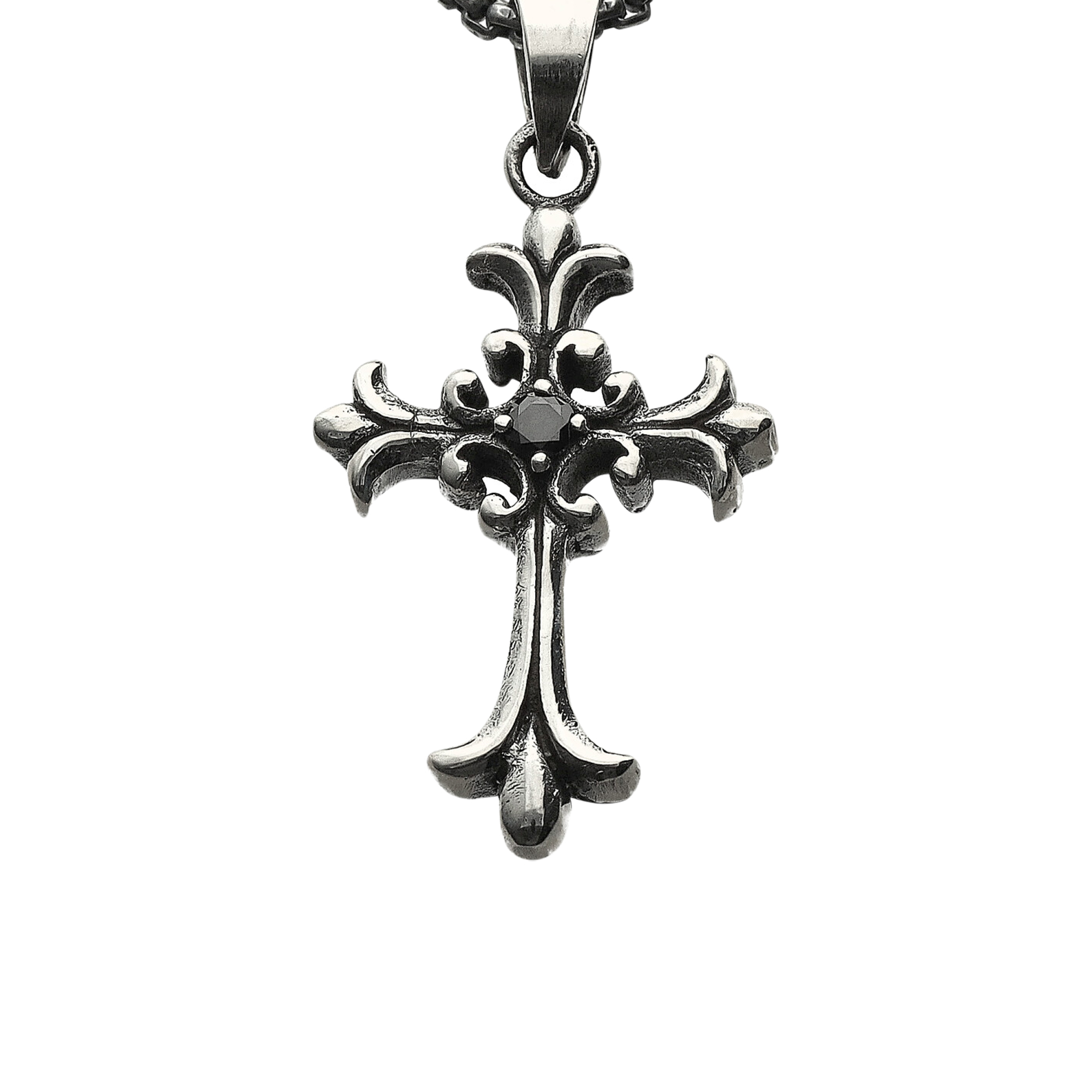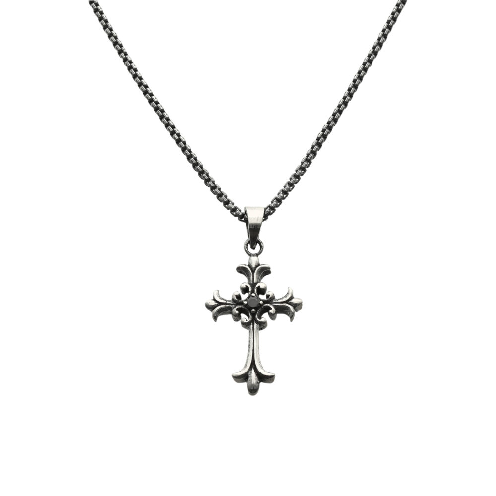 Collier argent massif croix gothique pierre zirconium noir