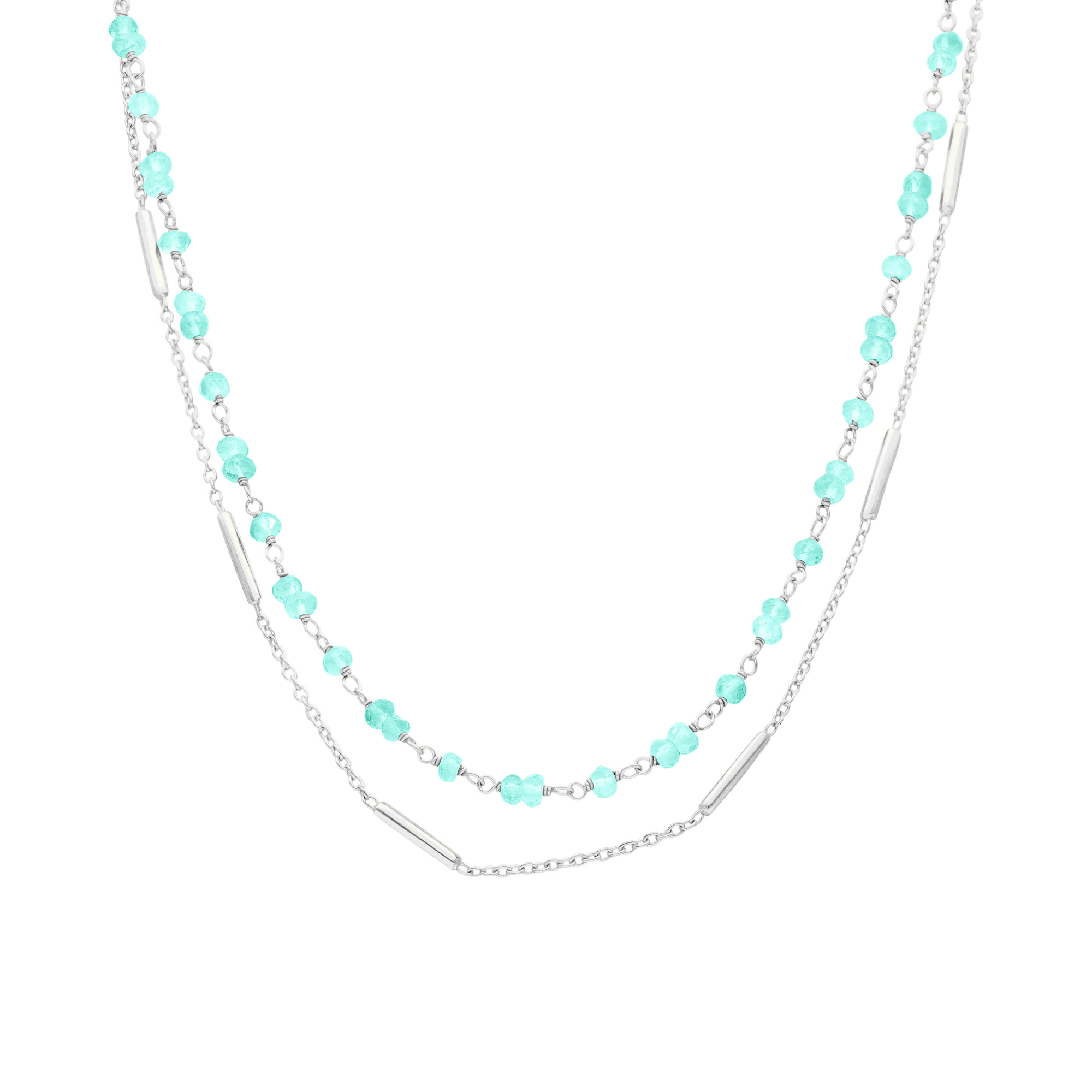 Collier argent rhodié doubles chaînes barrettes et perles naturelles amazonite