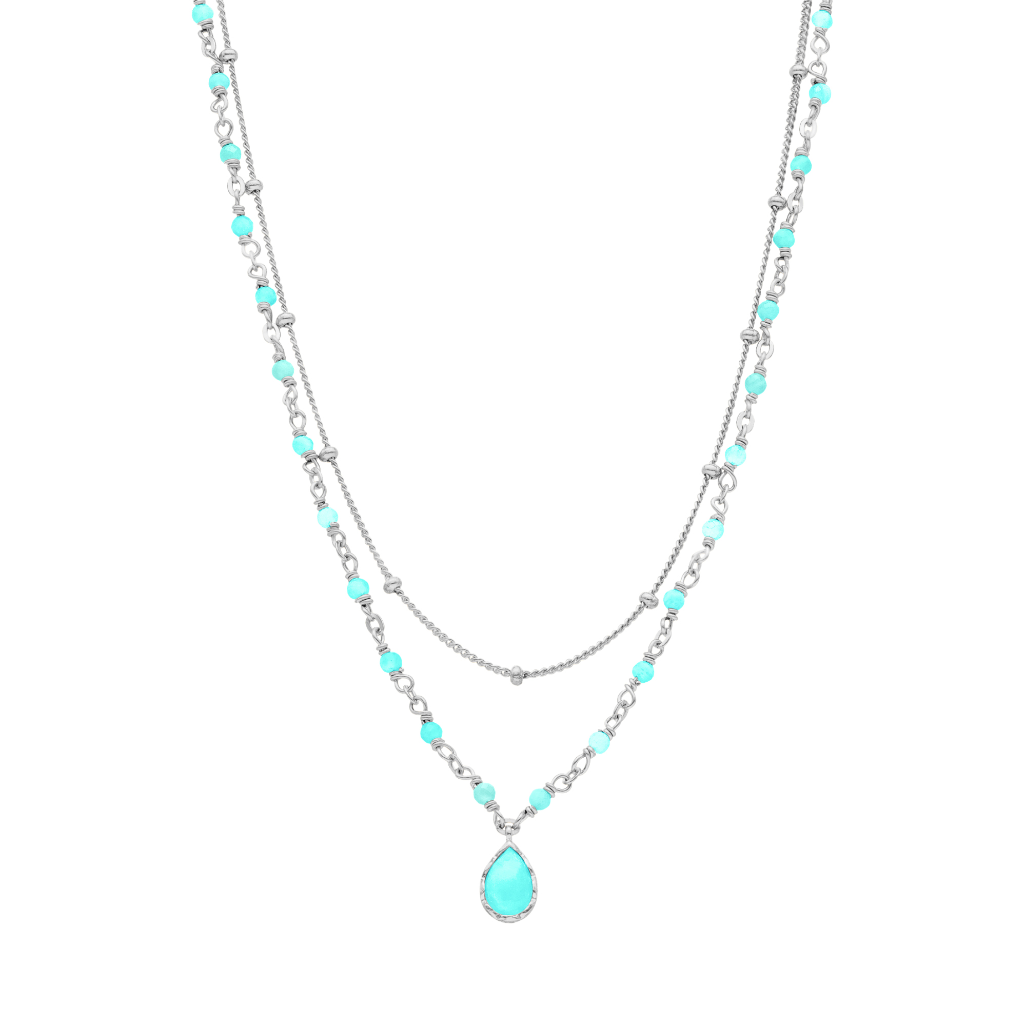 Collier argent rhodier goutte doubles chaînes pierres amazonite