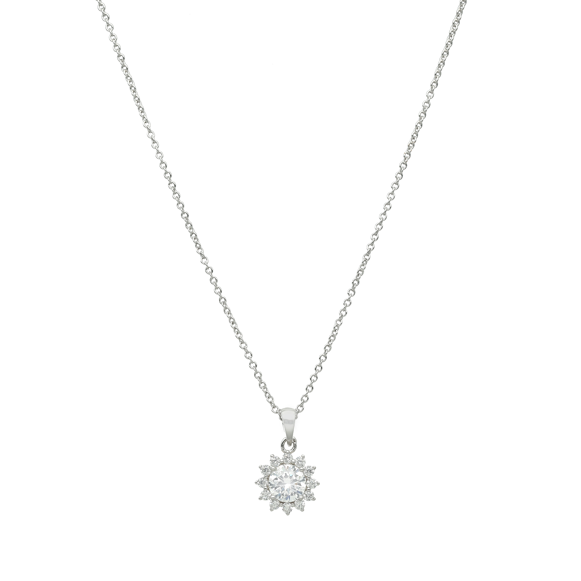 Collier argenté soleil serti. Le collier à une chaine en laiton argentée avec un pendentif en forme de soleil serti d’oxyde de zirconiums blanc !